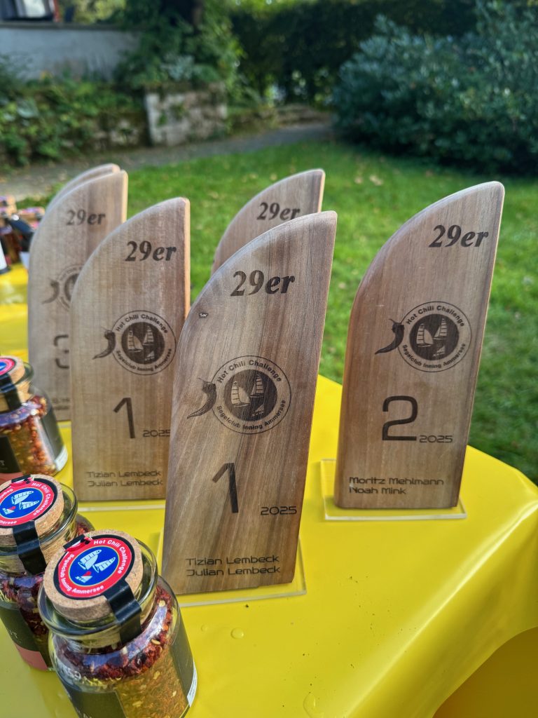 Alle Segler erhielten Chili-Flocken und Feuerzeuge für kleine Bootsarbeiten, die drei Erstplatzierten zudem eine Chilipflanze. Die selbst entworfenen und hergestellten Holzpokale wurden mit eingravierten Namen vergeben an: