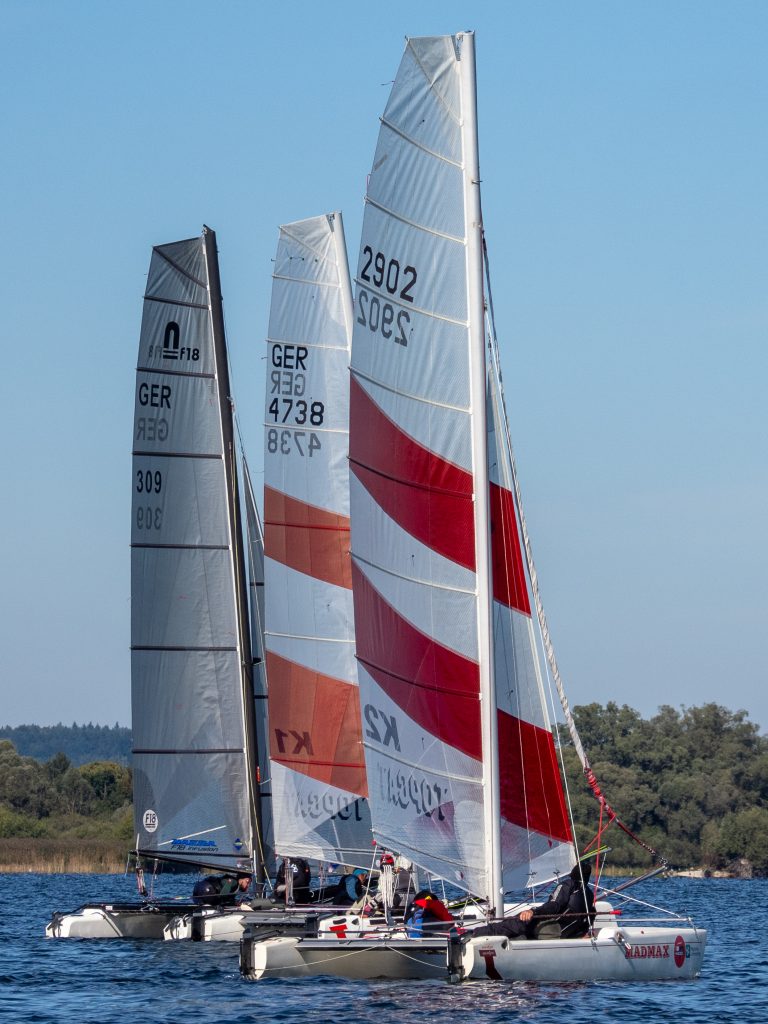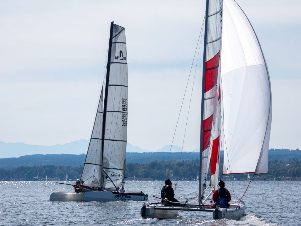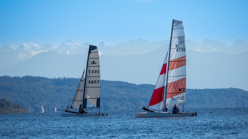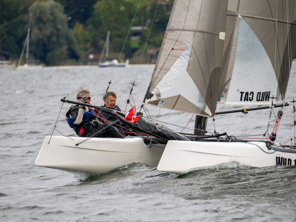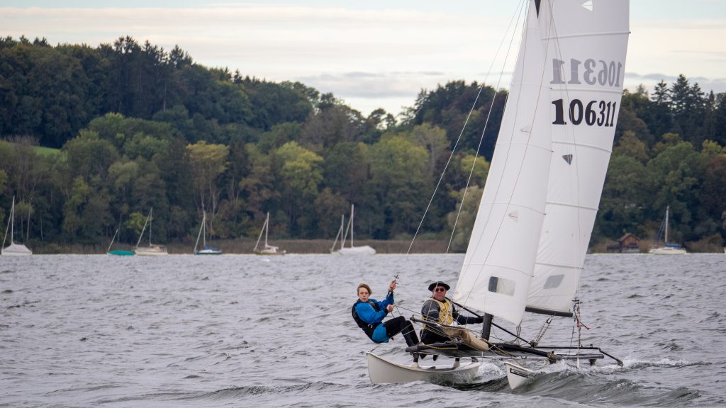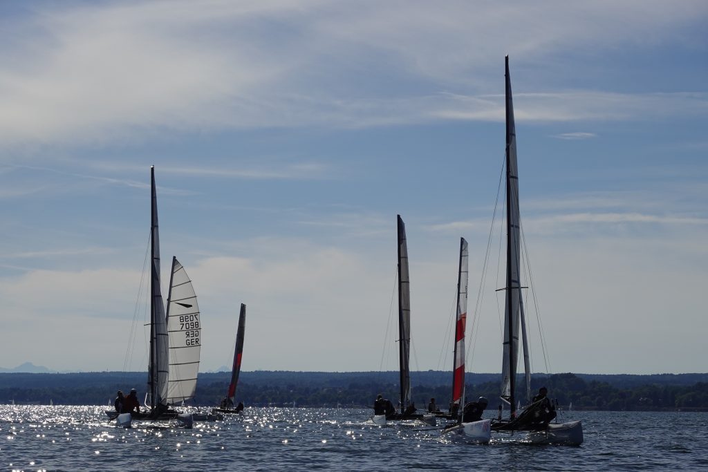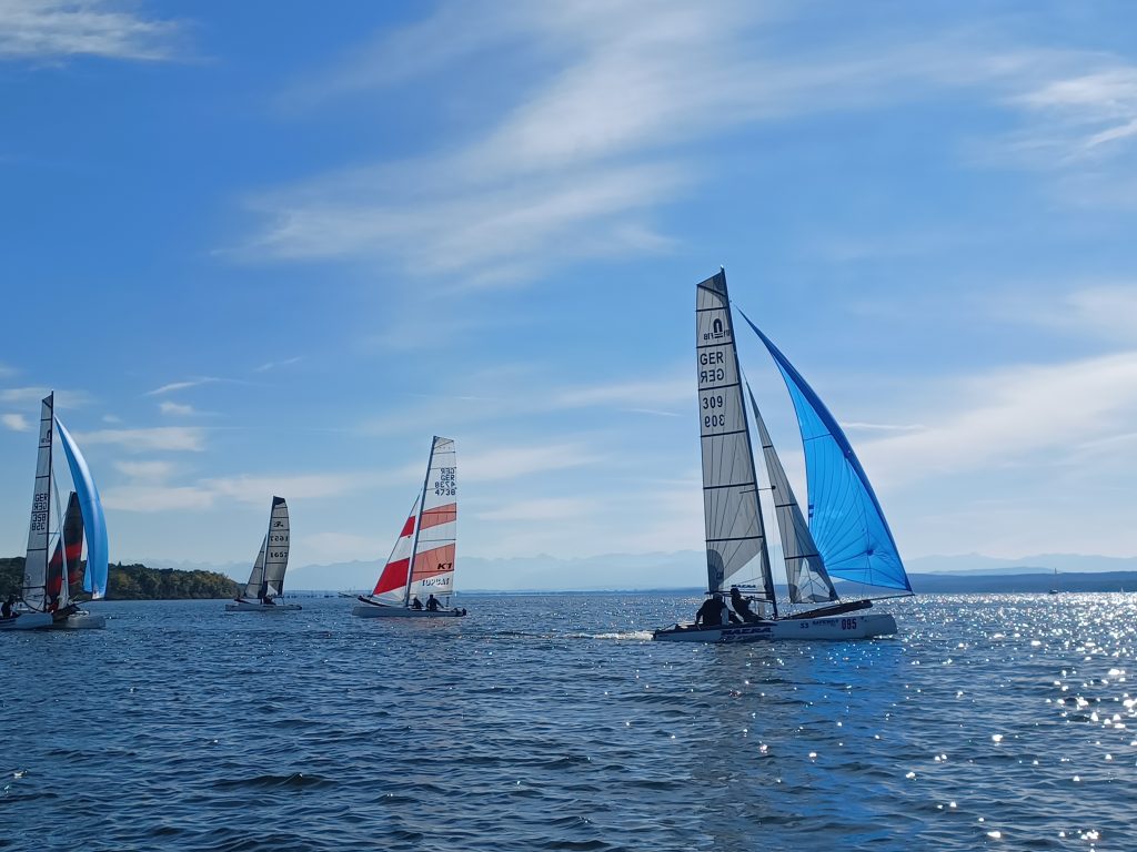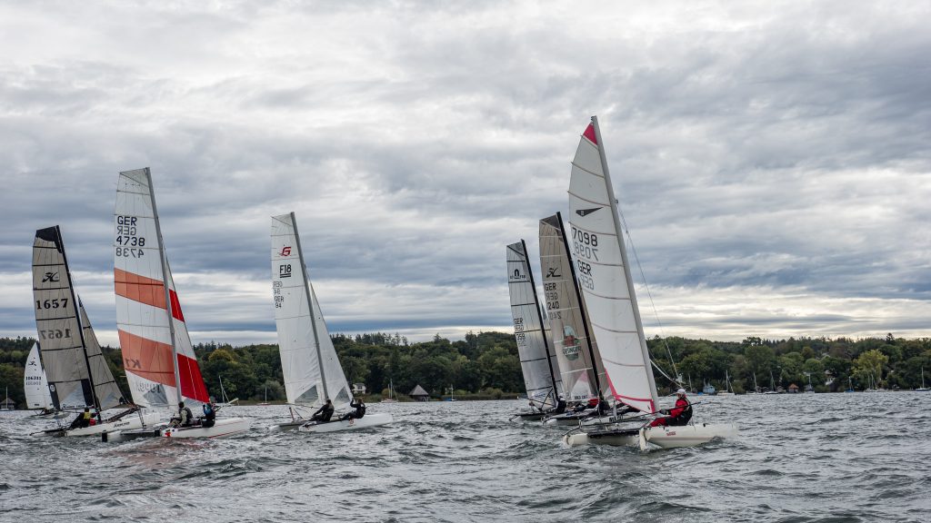 Alle Jahre wieder ist es soweit. Wies’n-Zeit ist Regattazeit im SCIA. Unsere traditionelle Katamaran-Regatta fand dieses Jahr am letzten Wies’n-Wochenende statt, zeitgleich zum Tag der Deutschen Einheit. Wir durften Gäste aus den benachbarten bayerischen Clubs begrüßen, und selbst aus Sachsen-Anhalt hat sich eine Crew auf den Weg zum Ammersee gemacht. Einige Teilnehmer und Helfer mussten wegen einer heftigen Erkältungswelle absagen, es ist halt Wies’n-Zeit. Aber wir bekamen 10 Boote an die Startlinie und konnten die Regatta fahren, auch dank der verlässlichen Helfer des SCIA. Es war eine Regatta vor dem Sturm, denn im Laufe des zweiten Tages war eine aufziehende Kaltfront mit heftigem Wind angekündigt.