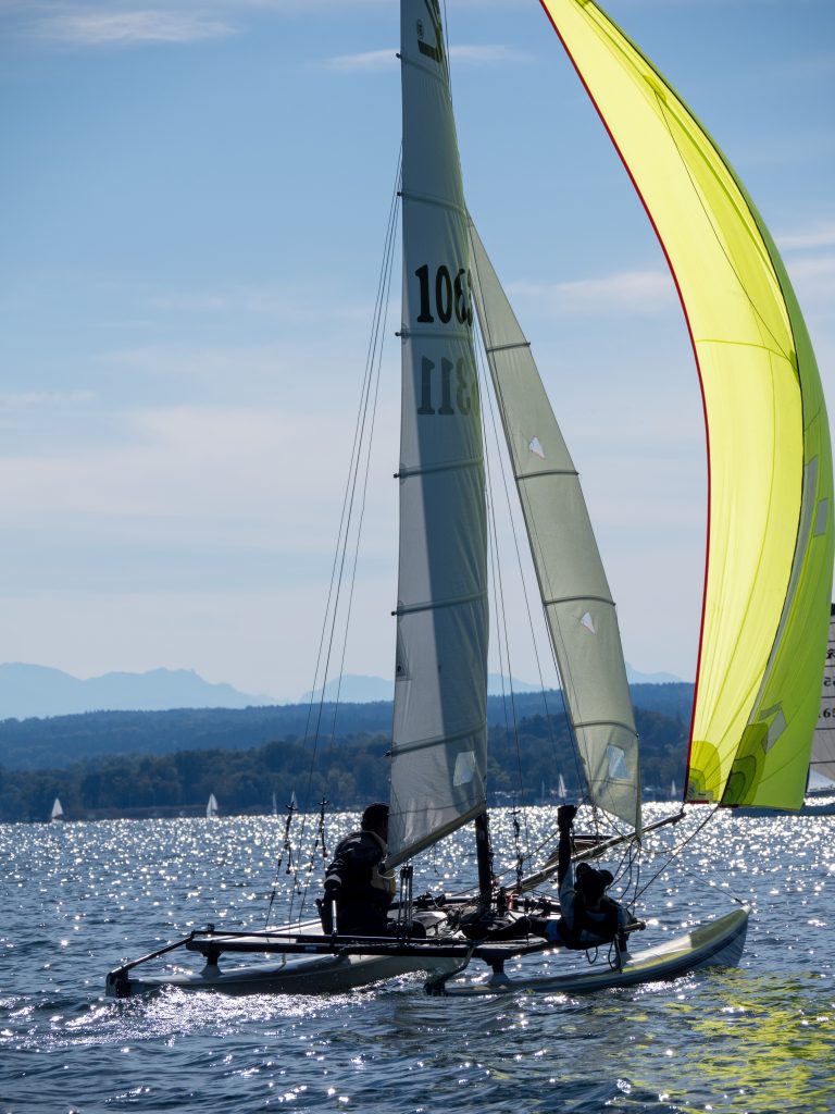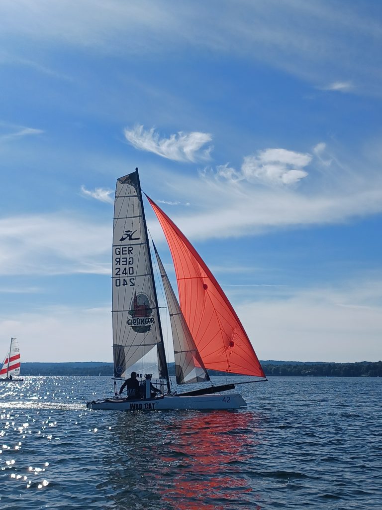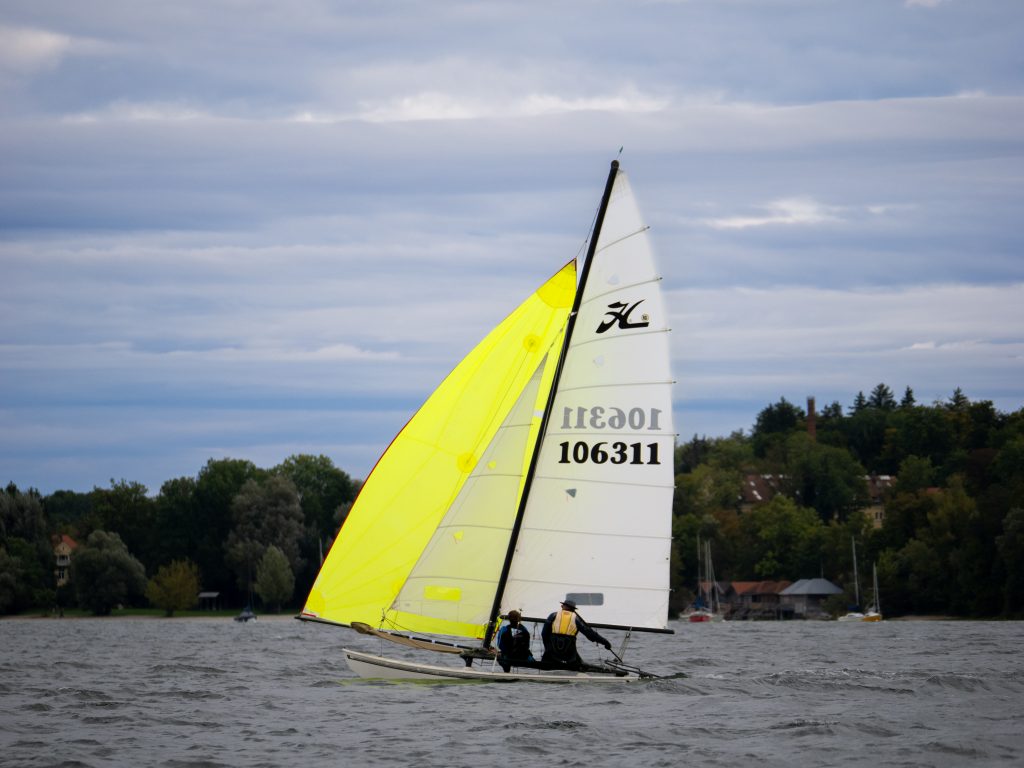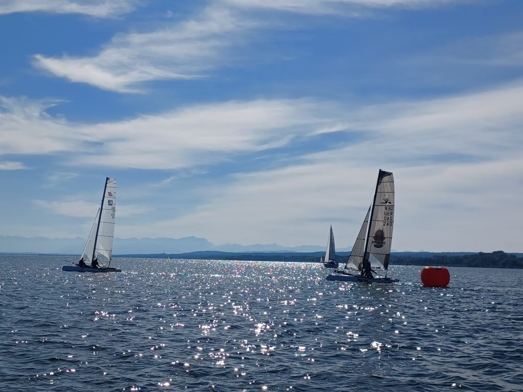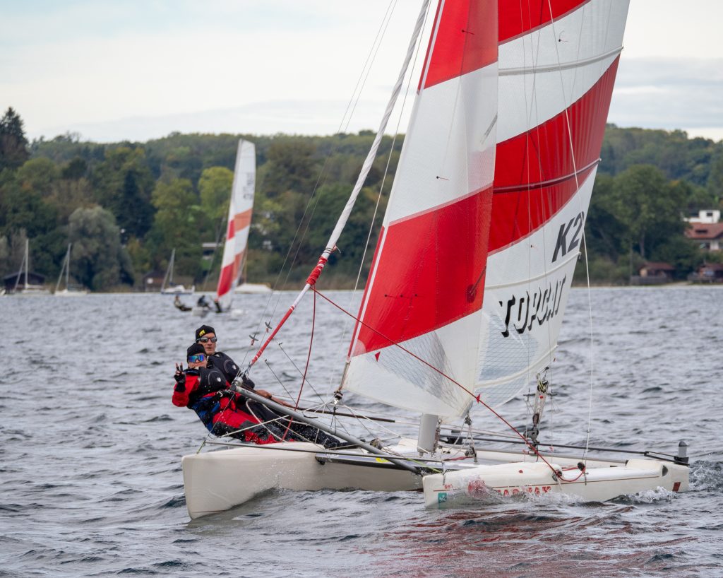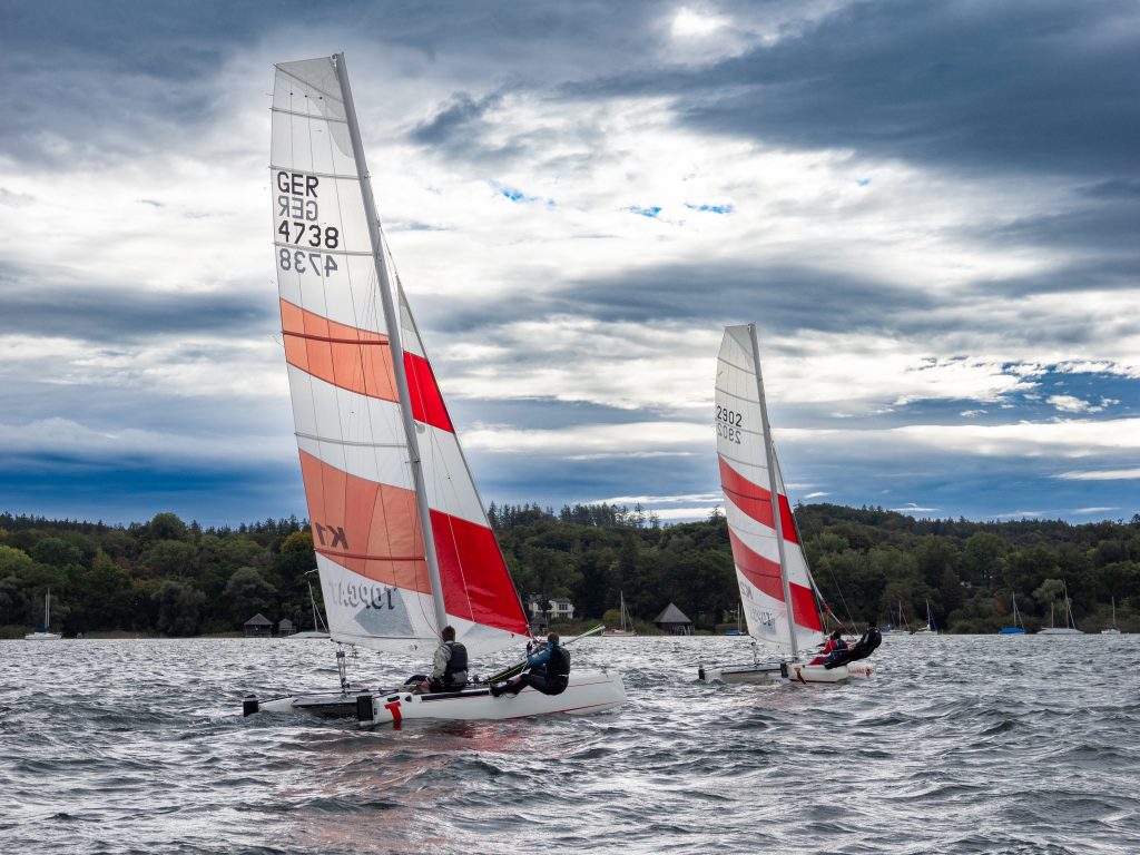 Alle Jahre wieder ist es soweit. Wies’n-Zeit ist Regattazeit im SCIA. Unsere traditionelle Katamaran-Regatta fand dieses Jahr am letzten Wies’n-Wochenende statt, zeitgleich zum Tag der Deutschen Einheit. Wir durften Gäste aus den benachbarten bayerischen Clubs begrüßen, und selbst aus Sachsen-Anhalt hat sich eine Crew auf den Weg zum Ammersee gemacht. Einige Teilnehmer und Helfer mussten wegen einer heftigen Erkältungswelle absagen, es ist halt Wies’n-Zeit. Aber wir bekamen 10 Boote an die Startlinie und konnten die Regatta fahren, auch dank der verlässlichen Helfer des SCIA. Es war eine Regatta vor dem Sturm, denn im Laufe des zweiten Tages war eine aufziehende Kaltfront mit heftigem Wind angekündigt.