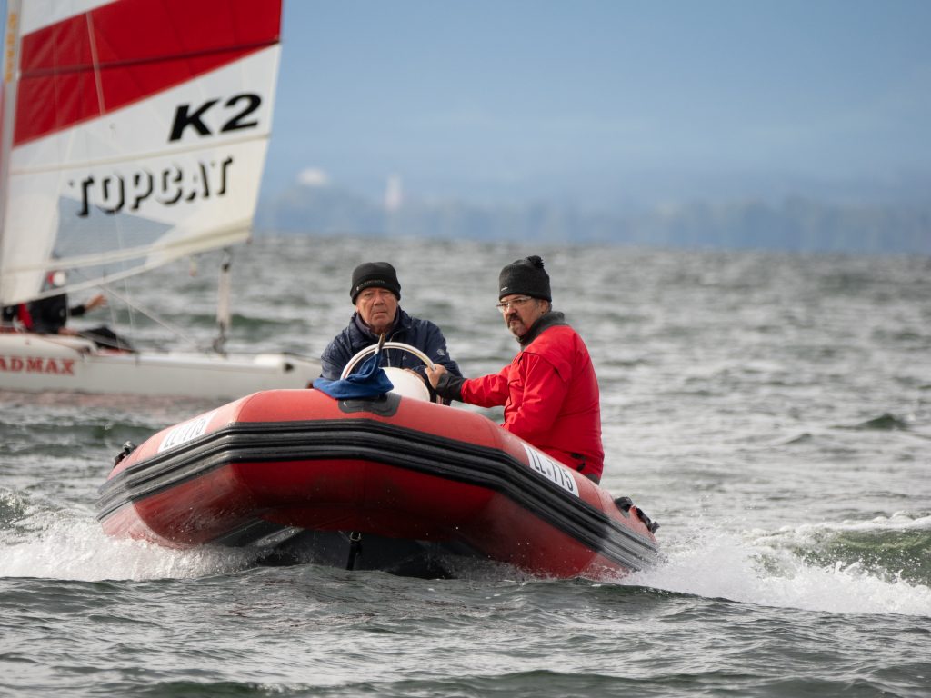 Auf dem Sicherungsboot haben mein Team-Partner und ich nichts weiter zu tun, als achtsam zu sein … außer einem gekenterten Kat gab es nix und der genannte Kat wurde von einem Profi gesegelt, der sein Schiff schnell wieder gestellt hat.