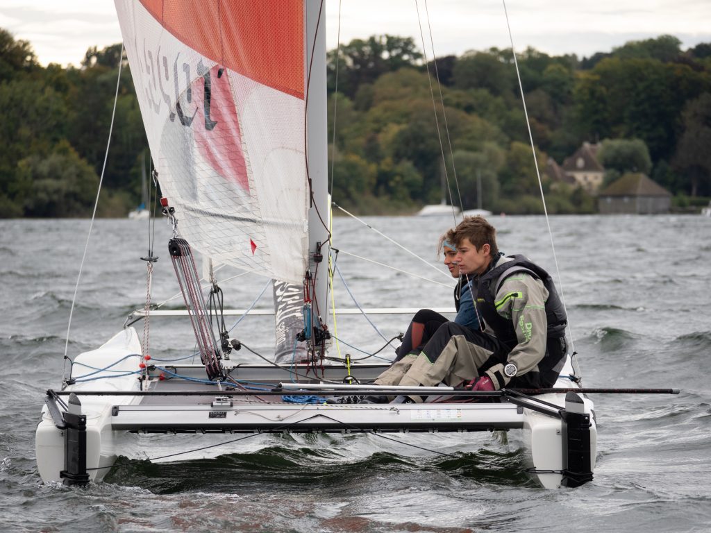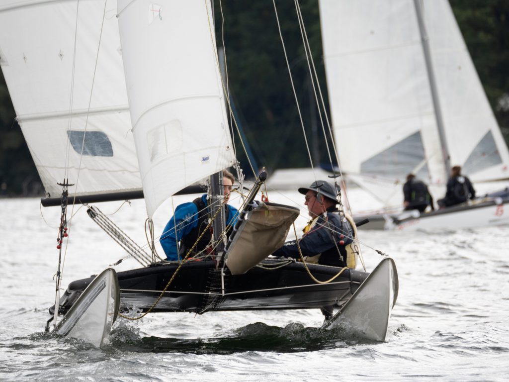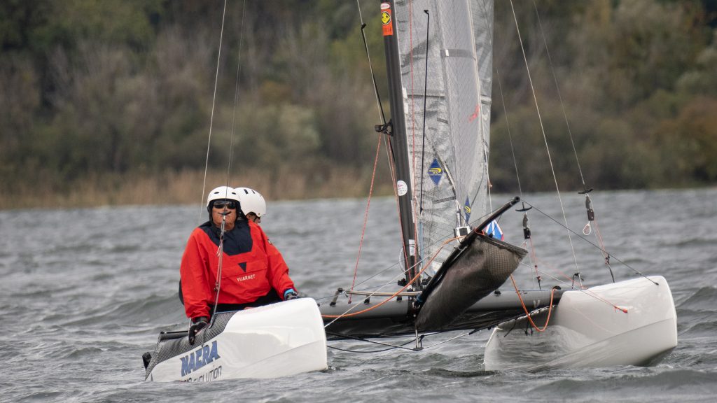 Am Samstag ging es früh los, denn der Sturm kündigte sich an. Der Wettfahrtleiter beschloss, zwei Wettfahrten vor dem Sturm zu fahren, um rechtzeitig an Land in Sicherheit zu sein. Eine hohe Welle zeugte bereits vom bevorstehenden Wetter, und auf der ersten Kreuz kam es zur ersten Kenterung, die zum Glück glimpflich ausging. Es waren zwei schnelle Wettfahrten, bei denen die Kats ihr volles Geschwindigkeitspotenzial zeigen konnten. Pfeilschnell schnitten sie durch das Wasser. Und nach knapp zwei Stunden ging es Richtung Richtung Land, während der Sturm an Kraft zulegte. Was im Sturm passieren kann, zeigte ein Kitesurfer, dessen Drachen in den hohen Bäumen des SCIA-Geländes landete und sich dort verfing. Zum Glück blieb der Kiter mit beiden Beinen auf dem Boden und unverletzt.